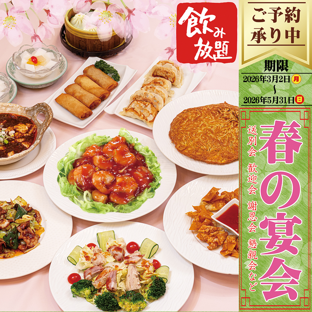 ![]() | 「梅蘭焼きそば」や「エビチリ」「小籠包」などを含む全10品+2時間飲み放題付き|歓送迎会◎料金:4,900円(税込)/1名様 |